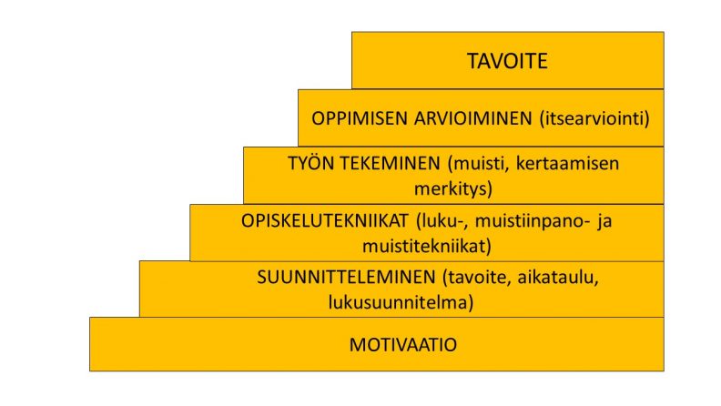 Alimmalla on portaalla motivaatio. Seuraavassa alaluvussa on lyhyesti sen merkityksestä ja miten sitä voidaan parantaa. Toisena portaana tulee opiskelun suunnitteleminen: tässä on käsitelty tavoitteen asettamista, ja käytännön vinkkejä aikataulun tekemiseen. Kolmannella portaana on opiskelutekniikat, joihin on koottu lyhyesti erilaisia tapoja opiskella, kuten luku- ja muistiinpanotekniikoita. Työn tekemisen portaaseen on sisällytetty tietoa muistista ja kertaamisen merkityksestä. Ennen tavoitteen saavuttamista oppimista tulisi arvioida. Tässä kohden avataan itsearviointia siinä.