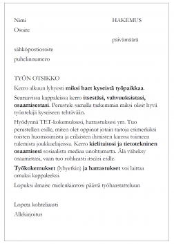 Kunkoululoppuu –verkkosivustolla on nuorille suunnatut työhakemusmallipohjat, joissa on esimerkkitekstit, kuinka tuoda esille itseään ja osaamistaan hakemuksessa. Toinen pohjista on nuorelle, jolla ei ole työkokemusta ja toinen on nuorelle, jolla on työkokemusta. Valmiin työhakemuksen voi näyttää tuttavalle ennen lähettämistä. Tällöin kirjoitusvirheet tulee helpommin huomioitua ja lisäksi toinen voi huomata jotain muokattavaa hakemuksesta.