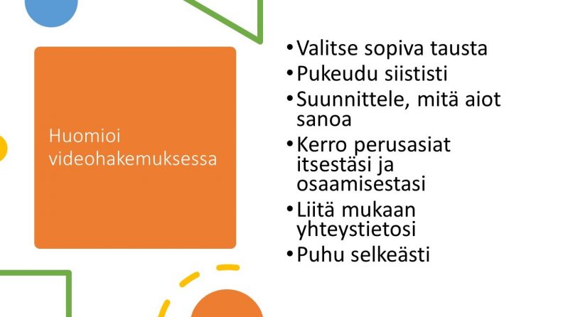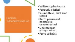 Tänä päivänä videohakemukset ovat tavallisia työnhaussa. Joskus videohakemusta käytetään jopa varsinaisena työhakemuksena, mutta se voi olla myös esimerkiksi hakemuksen lisänä tai jatkohakemisen yhteydessä. Varsinaisen työhakemuksen tavoin videohakemuksessa tulee kertoa, miksi on sopiva tehtävään, kuvata itseään ja osaamistaan. Videohakemukseen voi olla annettu myös tarkempia kysymyksiä, joihin siinä tulee vastata. Sen pituus voi olla myös määritetty. Jos videota ei ole tarkasti määritelty, niin sen tekemisessä voi hyödyntää, vaikka animaatiota (esimerkiksi https://www.animaker.com/). Työhakemus ja videotyöhakemus kannattaa harjoitella myös englannin kielellä. Erityisesti työpaikkoihin, kuten palvelualalle, voi erottua hakiessa osoittamalla kielitaitoaan videohakemuksessa, mutta se voi myös sisältyä itse hakemuksen ohjeistukseen.