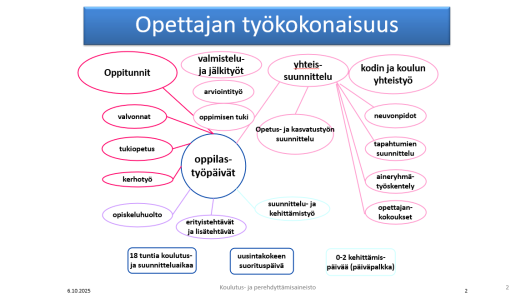 Opettajalle määrättyjen viikoittaisten opetus- ja muiden tehtävien lisäksi opettajan tulee osallistua koulussa opetuksen yhteissuunnitteluun, aineryhmittäisiin ja asiaryhmittäisiin neuvonpitoihin, kodin ja koulun väliseen yhteistyöhön sekä opetuksen suunnitteluun ja yhteiseen koulutukseen sekä koulun toiminnan kehittämiseen liittyvien tehtävien tekemiseen. Yhteissuunnittelutyöajan kokonaismäärä lukuvuoden aikana on PERUSOPETUKSESSA enintään 120 tuntia, mutta sitä tulee käyttää mahdollisuuksien mukaan tasaisesti koko lukuvuoden työaikana. Yhteissuunnittelutyöajan käyttö suunnitellaan oppilastyöpäiville.