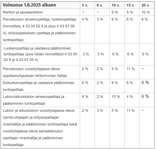Opetustyötä voidaan sopia lukuvuoden aikana vaihdettavaksi enintään 114 tuntia kehittämistyöhön / mentorointi -ja / tai tutortyöhön (1.8.2025 alkaen).