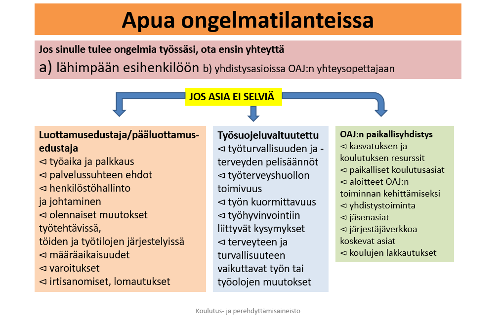 Jos ongelma ei ratkea, voit kysyä koulusi yhteysopettajalta, kehen kannattaa ottaa yhteyttä: luottamusedustajaan. pääluottamusedustajaan, työsuojeluvaltuutettuun vai onko oikea osoite OAJ:n paikallisyhdistys.